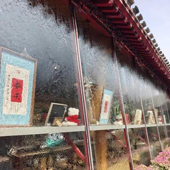 这家店是整条路线上最让我意外的一处。书店是四合院形制,外面看着安静,走进去才发现,一整面落地窗上,是流动的水雾瀑布,水顺着玻璃缓缓淌下,把窗外的树影和书法字叠在一起,像一幅活的山水画!